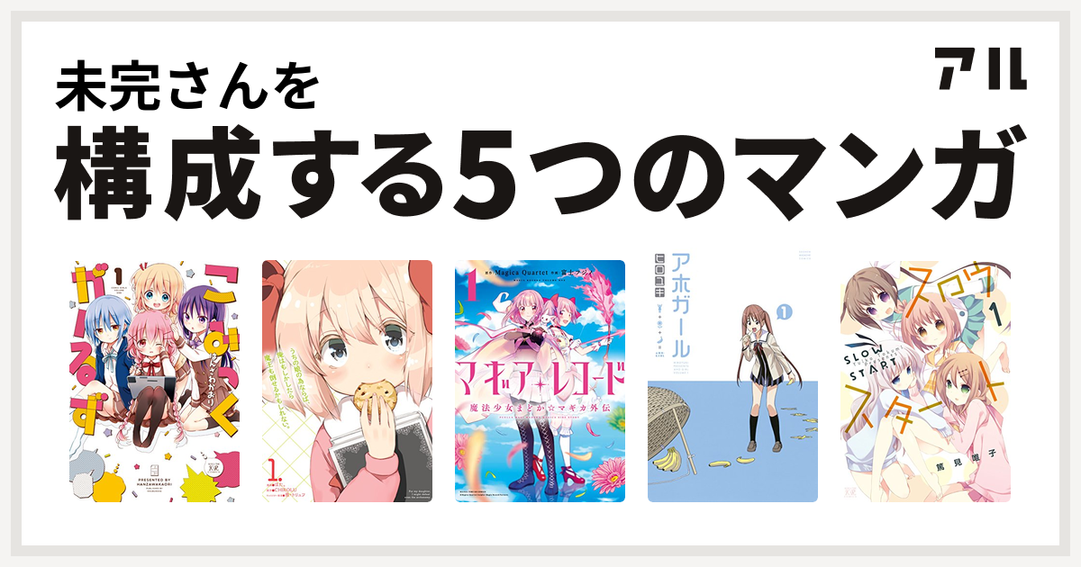 未完さんを構成するマンガはこみっくがーるず うちの娘の為ならば 俺はもしかしたら魔王も倒せるかもしれない マギアレコード 魔法少女まどか マギカ外伝 アホガール スロウスタート 私を構成する5つのマンガ アル